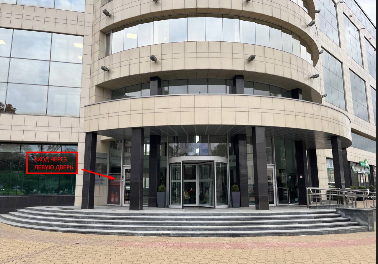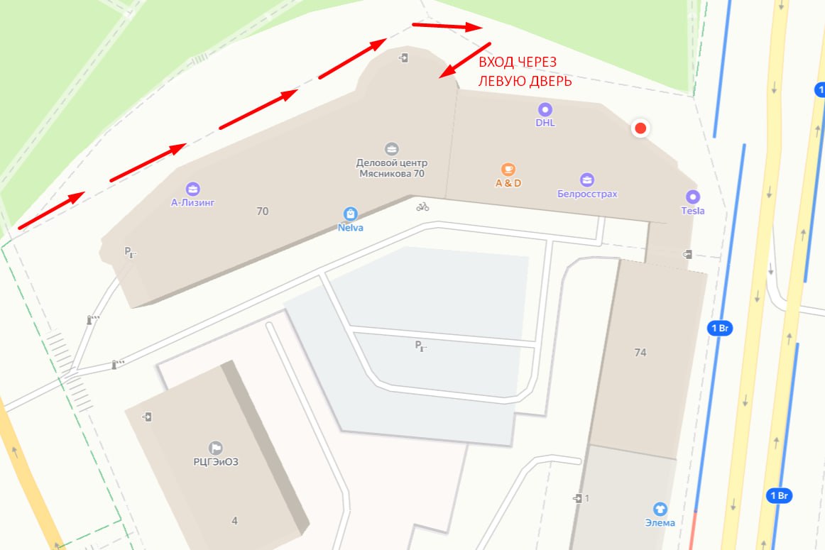 Вход в БЦ Мясникова 70 находиться со стороны Музыкального театра. В будние дни зайти в БЦ можно через левую дверь. На ресепшене Вас пропустят через турникет к лифтам. Поднимаетесь на 6 этаж в офис 24. В выходные дни двери работают по пропускной системе. На левой двери расположен домофон. Диспетчер Вам ответит после звонка в домофон и пропустит в БЦ.